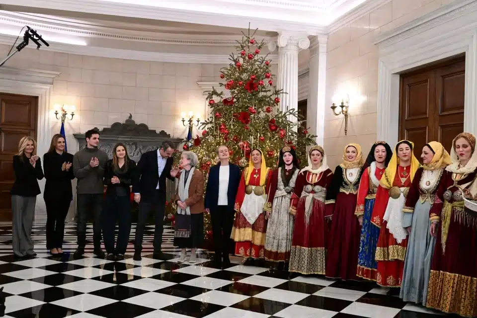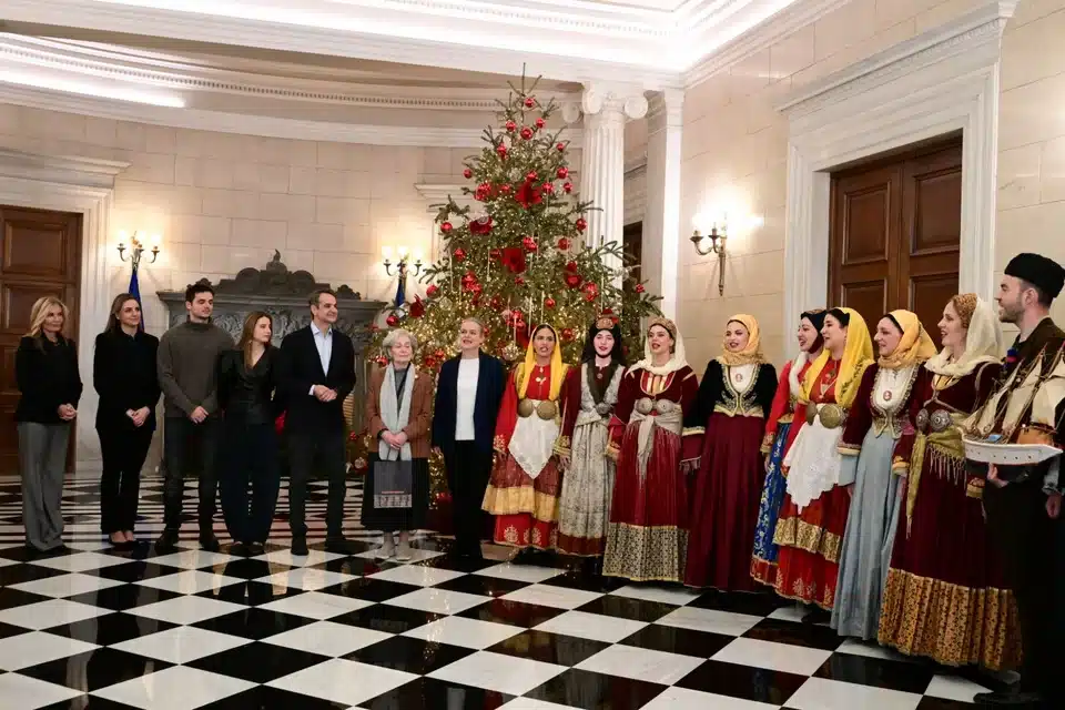 Με εορταστική διάθεση, ο πρωθυπουργός Κυριάκος Μητσοτάκης άνοιξε τις πόρτες του Μεγάρου Μαξίμου την παραμονή των Χριστουγέννων για να υποδεχθεί παραδοσιακά κάλαντα από διάφορες ομάδες.