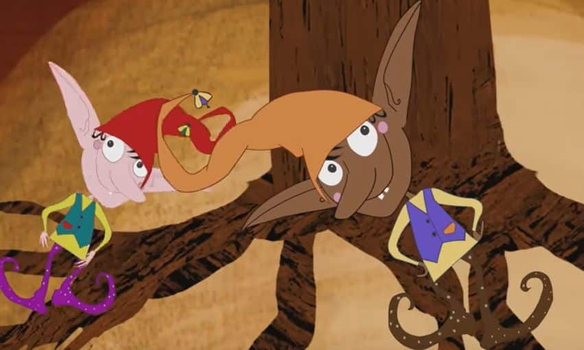 Την ώρα που λάλησε ο πρώτος πετεινός, εξαντλημένα τα καλικαντζαράκια αφήσανε τα ταψιά στα κεραμίδια ενός σπιτιού κι αρχίσανε να φεύγουν τρέχοντας με στριγκλιές και γέλια, βγάζοντας έξω τις γλώσσες τους που ήταν κατακόκκινες σαν τις γλώσσες της φωτιάς και κουνούσαν τις ουρές τους εδώ κι εκεί.