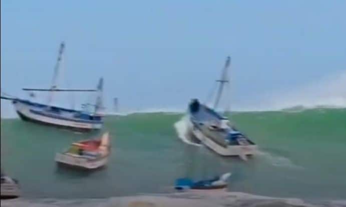Αλιευτικά σκάφη φαίνονται να θρυμματίζονται, ενώ άλλα βίντεο δείχνουν τα κύματα να ξεχύνονται στην ενδοχώρα και να πλημμυρίζουν πόλεις.