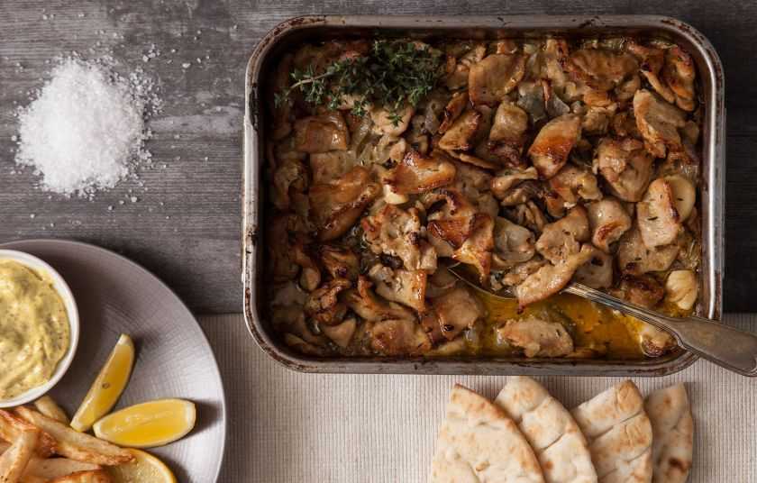 Πασπαλίζουμε με το θυμάρι, σκορπίζουμε ομοιόμορφα τις φέτες λεμονιού και σερβίρουμε. Συνοδεύουμε με ξεροψημένες πίτες για σουβλάκι και πράσινη σαλάτα.