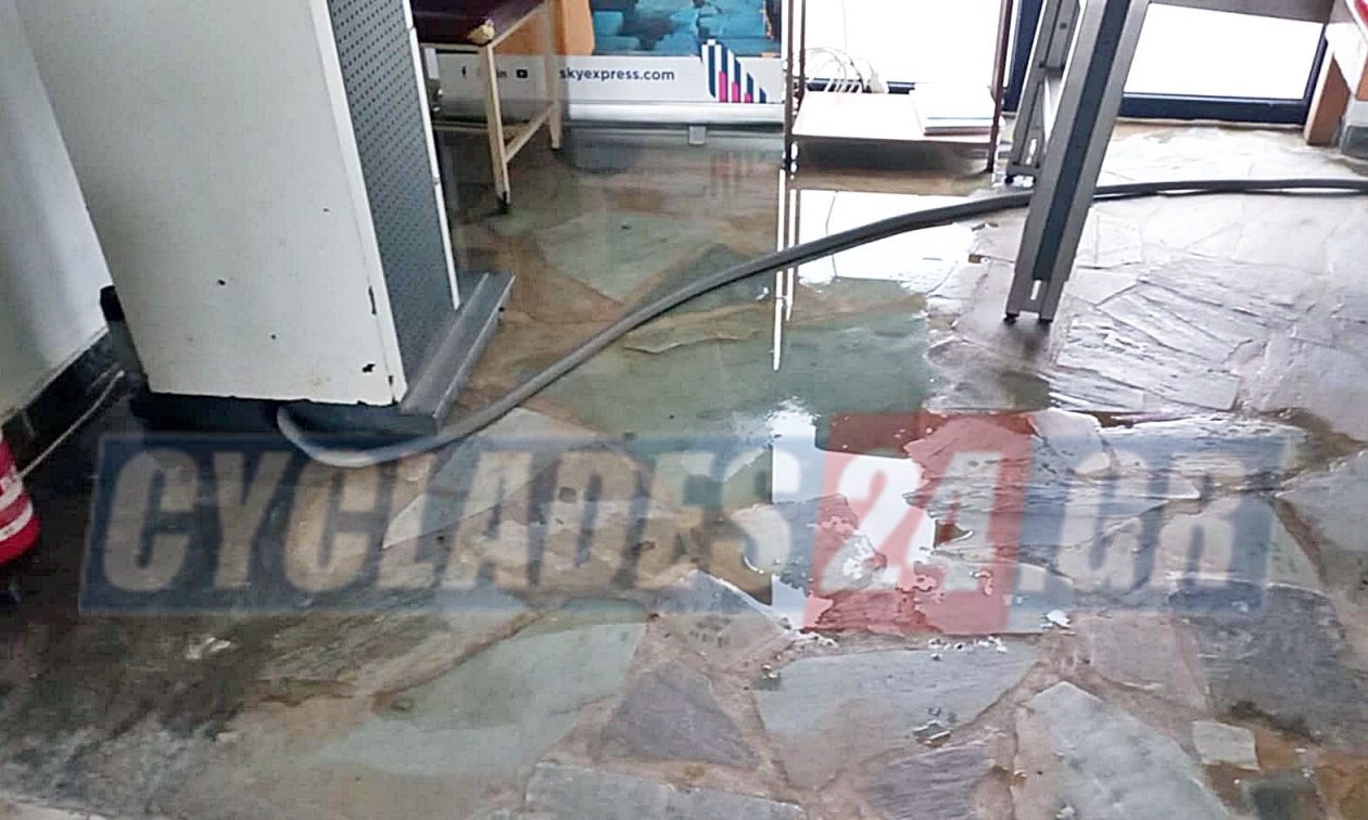 Εκτός από το περιστατικό με το πλοίο που δεν κατάφερε να δέσει στο λιμάνι λόγω των ισχυρών ανέμων, αλλά και την πτώση δέντρου, το αεροδρόμιο του νησιού πλημμύρισε από τα ορμητικά νερά.