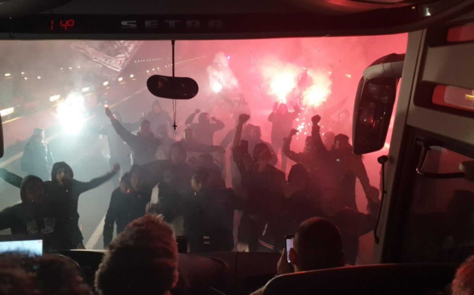 Μόλις το πούλμαν του ΠΑΟΚ έφτασε περίπου στη διασταύρωση της Χρυσούπολης, οι φίλοι της ομάδας έκαναν την εμφάνιση τους και .. έκαναν τη νύχτα – μέρα με τους πυρσούς τους.