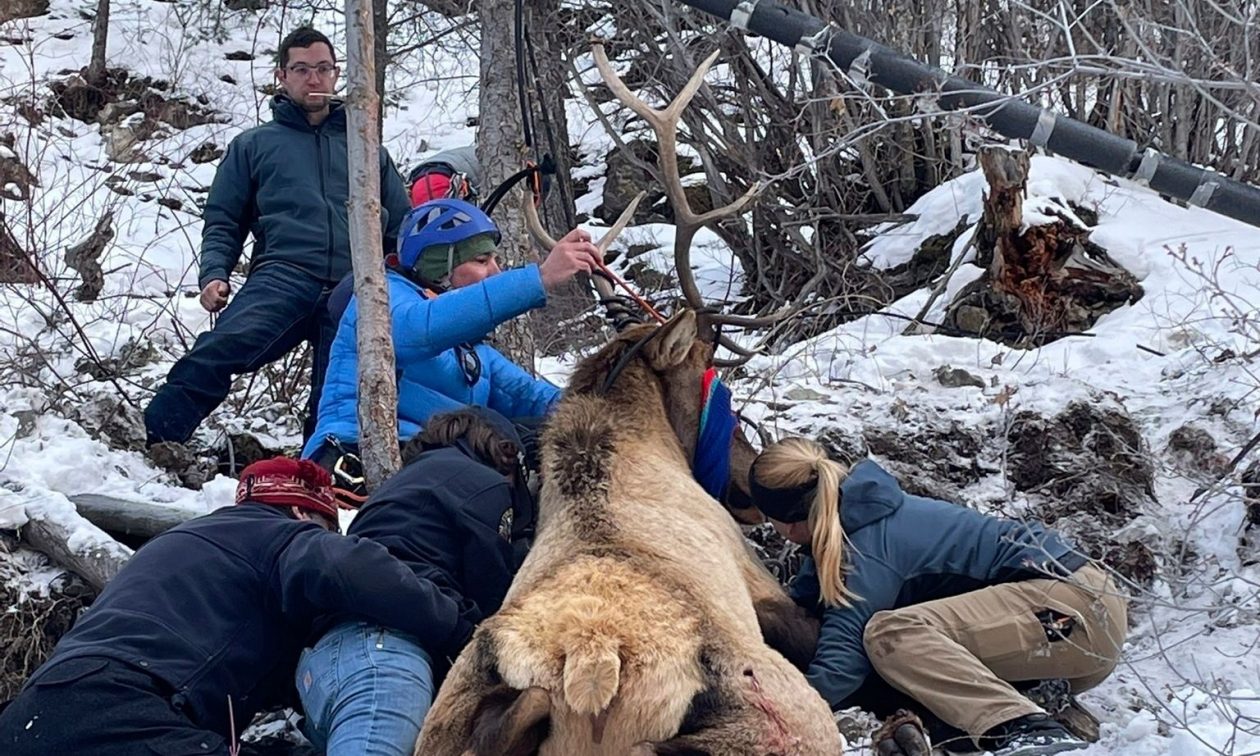 Οι αξιωματούχοι του Colorado Parks and Wildlife δήλωσαν ότι μια ομάδα αναρριχητών στο Lake City συνάντησε το πρωί της Παρασκευής την ταλαιπωρημένη άλκη. Φτάνοντας στο σημείο ένας βιολόγος του CPW έδωσε στο ζώο ένα ηρεμιστικό και κάλυψε μέρος του κεφαλιού του με μια μάσκα του σκι για να προστατεύσει τα μάτια του κατά τη διάρκεια της διάσωσης, όπως αναφέρει το Associated Press.