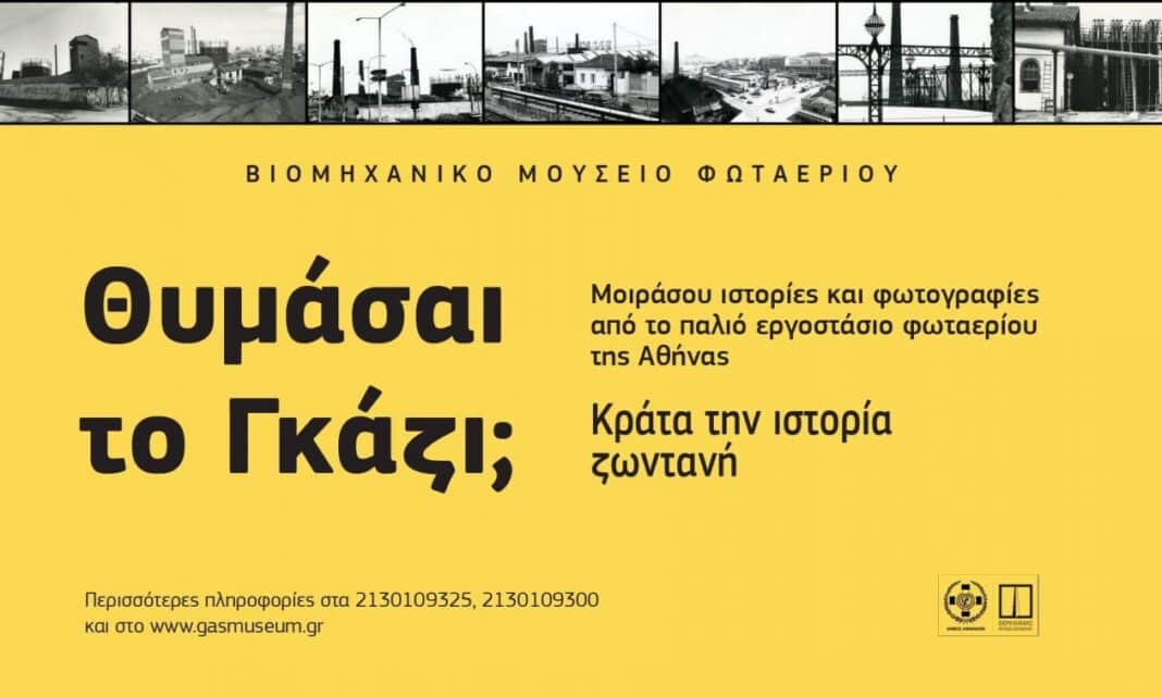 Το Βιομηχανικό Μουσείο Φωταερίου της Τεχνόπολης Δήμου Αθηναίων καλεί τους κατοίκους της περιοχής Γκαζιού, καθώς και τους παλιούς εργαζόμενους του εργοστασίου φωταερίου στην Αθήνα να συμμετάσχουν στη νέα δράση συλλογής προφορικών μαρτυριών, αντικειμένων, φωτογραφιών και εγγράφων.