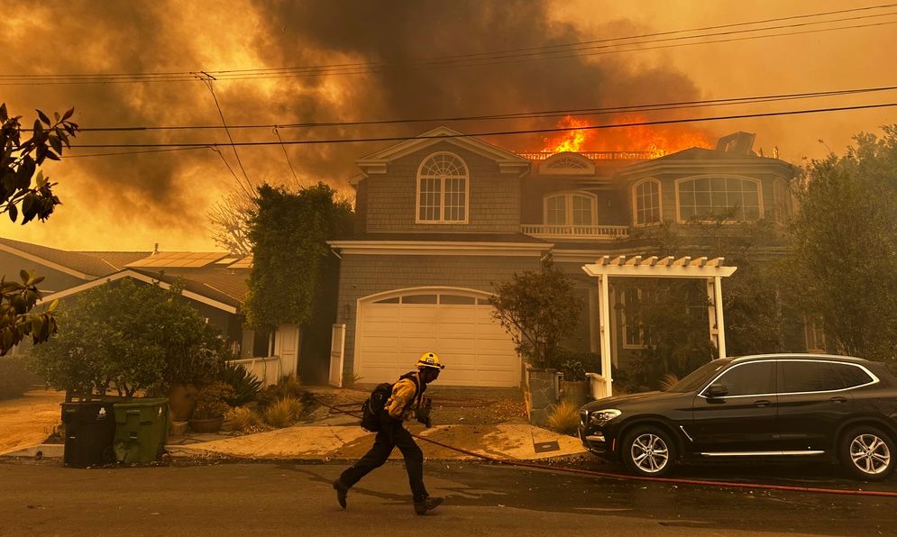 Στην ακτή του Ειρηνικού δυτικά του κέντρου του Λος Άντζελες, μια μεγάλη πυρκαγιά ισοπέδωσε ολόκληρα τετράγωνα, μετατρέποντας παντοπωλεία και τράπεζες σε ερείπια στο Pacific Palisades, μια περιοχή στην πλαγιά του λόφου κατά μήκος της ακτής που είναι διάσπαρτη με σπίτια διασημοτήτων και που μνημονεύτηκε από τους Beach Boys στην επιτυχία της δεκαετίας του 1960 «Surfin’ USA.»