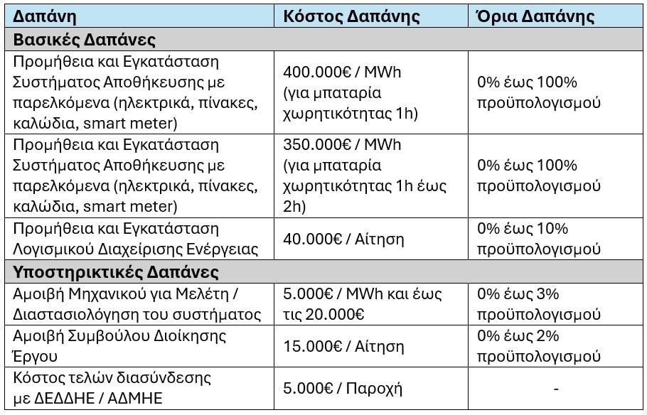 Στις επιλέξιμες δαπάνες είναι κυρίως οι συσσωρευτές μαζί με τα παρελκόμενα (καλώδια, πίνακες, ασφάλειες), το λογισμικό διαχείρισης ενέργειας, η αμοιβή μηχανικού-μελετητή για την διαστασιολόγηση του συστήματος, η αμοιβή του συμβούλου διοίκησης του έργου και τα τέλη σύνδεσης ΔΕΔΔΗΕ/ΑΔΜΗΕ.