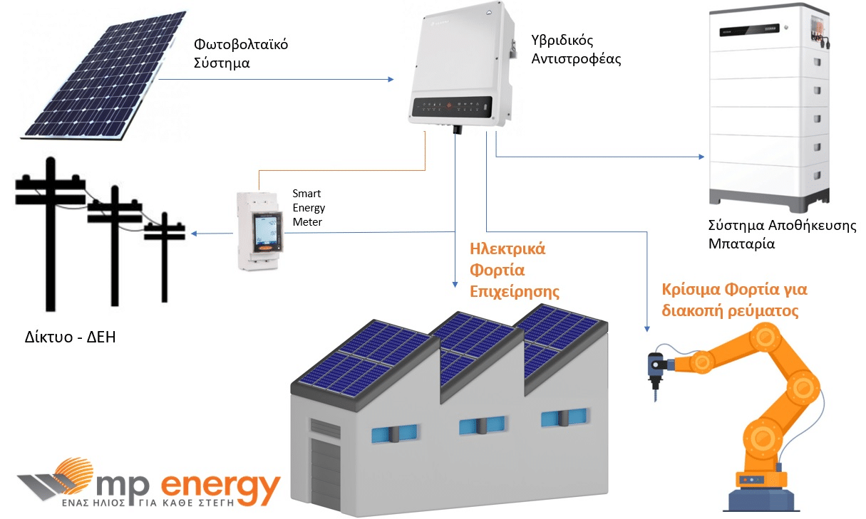 Το τεράστιο ενεργειακό κόστος που πλήττει τις ελληνικές επιχειρήσεις αποτελεί τροχοπέδη για την ανάπτυξη και την ανταγωνιστικότητά τους έναντι των επιχειρήσεων άλλων χωρών. Το πρόγραμμα «συστήματα αποθήκευσης στις επιχειρήσεις» αποτελεί την βέλτιστη λύση για την μείωση του κόστους ρεύματος. Η σωστή επιλογή τεχνικής εταιρείας εγγυάται την αξιόπιστη λειτουργία και την βέλτιστη απόδοση του φωτοβολταϊκού συστήματος.