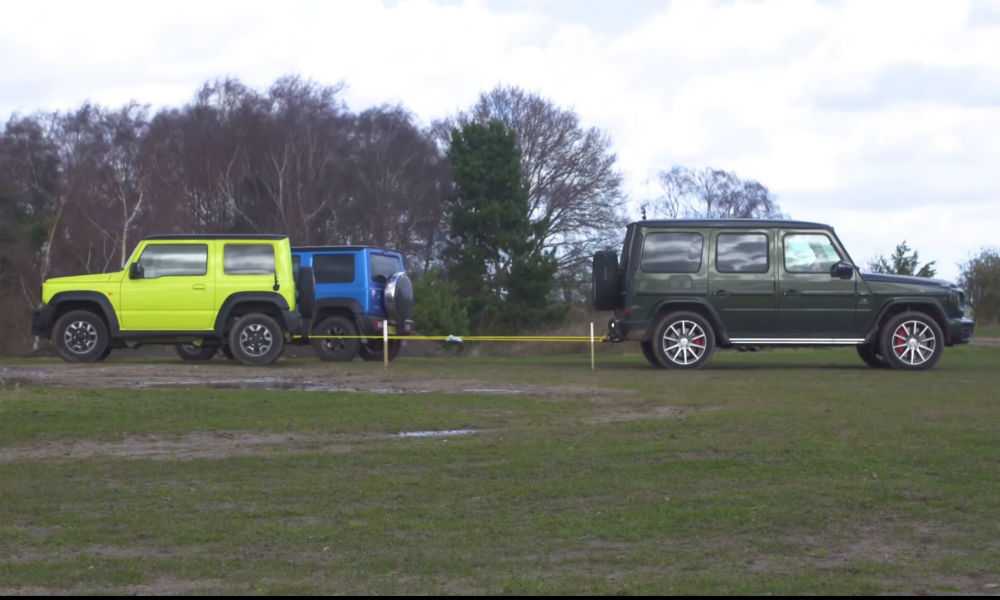 Απολύτως αναμενόμενα, το Jimny δεν μπορεί καν να κουνήσει την G63 όταν ο οδηγός της δεύτερης απλά πατάει το φρένο. Μετακινώντας το πόδι του στο γκάζι, η Mercedes μετατρέπεται σε ταχύπλοο και το Suzuki σε σκιέρ. Ακόμα και 2 Jimny δεν μπορούν να φέρουν βόλτα την «Γερμανίδα», ενώ μόνο όταν γίνουν 3 και ο σκουφακιοφόρος πίσω από το τιμόνι του γερμανικού SUV παραλείψει να πατήσει γκάζι, μπορούν να υπερηφανευτούν πως κέρδισαν. Και σε αυτή την περίπτωση, πάντως, οι αριθμοί είναι υπέρ της G-Class: 3 Jimny ισοδυναμούν σε συνδυαστική ισχύ 306 ίππων και 390 Nm ροπής, με το βάρος να φτάνει τα 3.400 κιλά. Κάτι που σημαίνει ότι αν τα διαφορικά ήταν μπλοκαρισμένα, η τετρακίνηση 4MATIC κατάλληλα ρυθμισμένη και ο οδηγός αξιοποιούσε τα 761 Nm της ροπής, ενδεχομένως η G-Class να πήγαινε βόλτα τα «τρία αδέρφια».