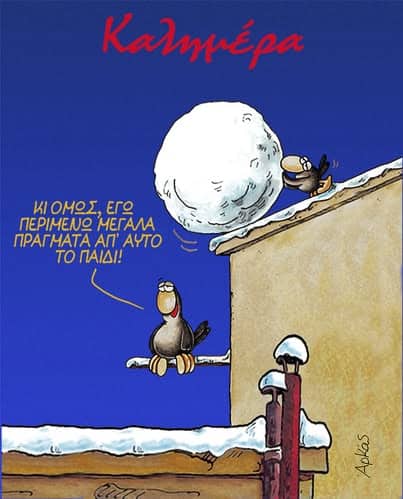 Η σκηνή, όμως, είναι ξεκαρδιστική, καθώς ο «μικρός ήρωας» προετοιμάζει μια τεράστια χιονόμπαλα, που φαίνεται έτοιμη να κατρακυλήσει κατευθείαν προς τον μπαμπά του! Η αντίθεση μεταξύ της προσμονής του πατέρα και της επερχόμενης… ψυχρής έκπληξης κάνει το σκίτσο απλά απολαυστικό.
