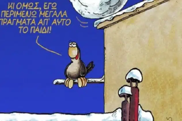 Η σκηνή, όμως, είναι ξεκαρδιστική, καθώς ο «μικρός ήρωας» προετοιμάζει μια τεράστια χιονόμπαλα, που φαίνεται έτοιμη να κατρακυλήσει κατευθείαν προς τον μπαμπά του! Η αντίθεση μεταξύ της προσμονής του πατέρα και της επερχόμενης… ψυχρής έκπληξης κάνει το σκίτσο απλά απολαυστικό.