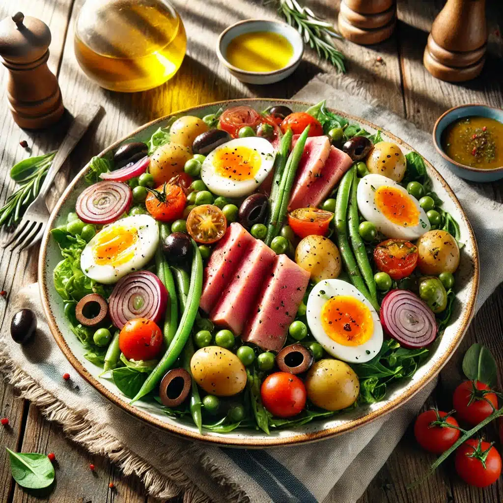 Η σαλάτα Νισουάζ αποτελεί ένα από τα πιο κλασικά πιάτα της γαλλικής κουζίνας, που αποπνέει φρεσκάδα και ισορροπία γεύσεων. Με καταγωγή από την περιοχή της Νίκαιας, συνδυάζει απλά αλλά πλούσια υλικά που τη μετατρέπουν σε ένα ολοκληρωμένο γεύμα. Ιδανική για μεσημεριανό ή βραδινό, αυτή η σαλάτα είναι πλούσια σε πρωτεΐνες και θρεπτικά συστατικά.