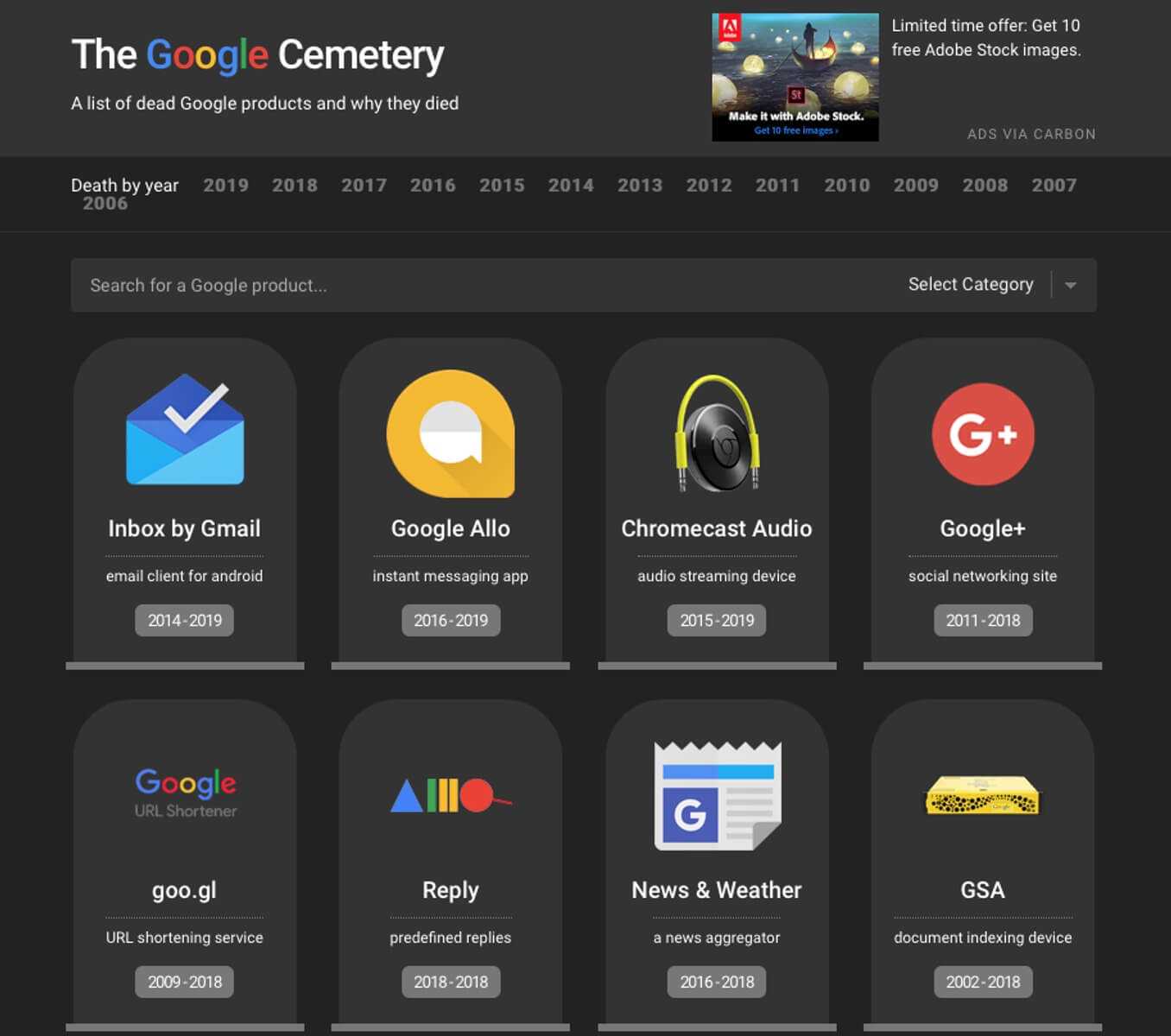 Η Google έβαλε «λουκέτο» την Τρίτη 2 Απριλίου στην πλατφόρμα κοινωνικής δικτύωσης Google+, που ποτέ δεν κατάφερε να προσελκύσει αρκετούς χρήστες και ατύχησε ως ανταγωνιστής του Facebook. Το Google+ ετάφη στο λεγόμενο Google Cemetery.