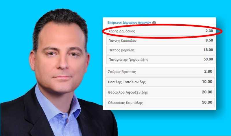 Μετά τις δημοσκοπήσεις που δείχνουν ότι ο Χάρης Δαμάσκος και η δημοτική του παράταξη “ΔΕΚΑ” βρίσκονται στην κορυφή των πολιτών του Μενιδίου Αττικής, στις αποδόσεις των στοιχηματικών, τα χαμηλότερα ποσοστά αποδόσεων για τους υποψήφιους δημάρχους στις ερχόμενους εκλογές, δείχνουν την πραγματική εικόνα που επικρατεί στο δήμο.