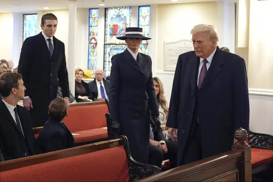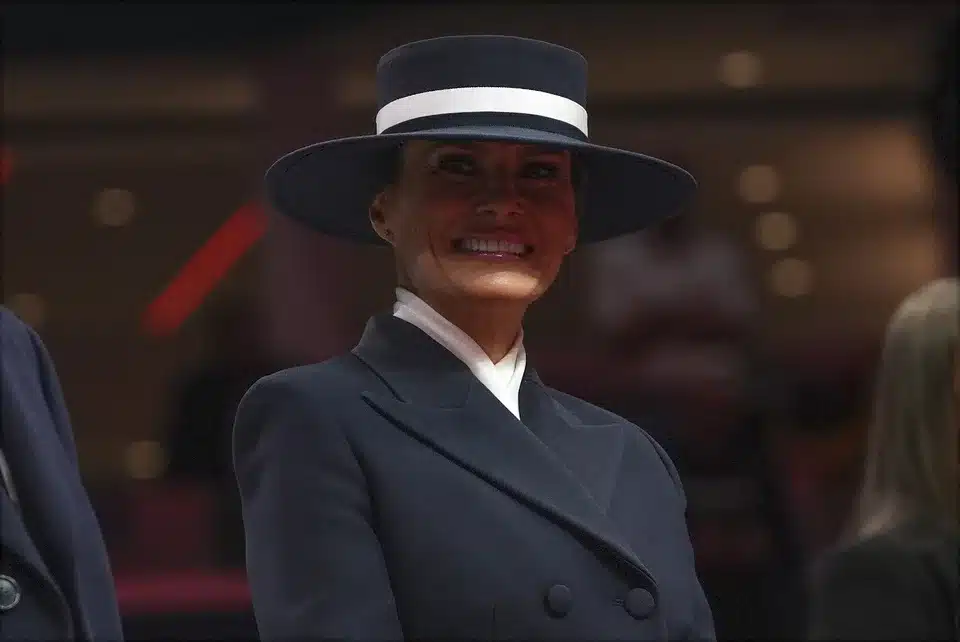 Η Μελάνια Τραμπ τράβηξε τα βλέμματα με την κομψή της εμφάνιση, φορώντας ένα εντυπωσιακό blue-black σύνολο με καπέλο. Στο πλευρό της, ο πανύψηλος γιος του ζεύγους, Μπάρον, έκλεψε επίσης την παράσταση. Μια αμήχανη στιγμή σημειώθηκε όταν ο Τραμπ προσπάθησε να φιλήσει τη σύζυγό του, αλλά εμποδίστηκε από το καπέλο της.