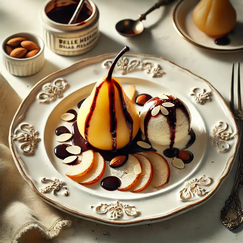 - Σερβίρισμα: Τοποθετήστε κάθε αχλάδι σε ένα πιάτο. Ρίξτε τη ζεστή σάλτσα σοκολάτας από πάνω, προσθέστε μια μπάλα παγωτό βανίλια στο πλάι και γαρνίρετε με φιλέ αμυγδάλου, αν θέλετε.