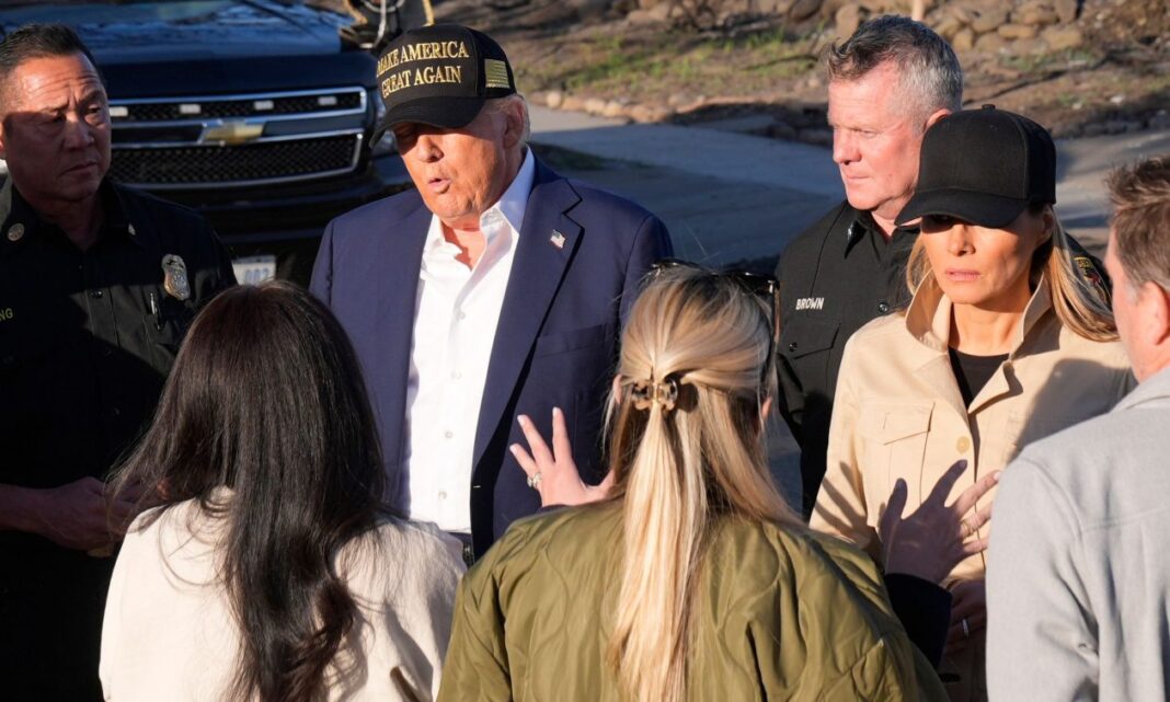 Ο πρόεδρος Ντόναλντ Τραμπ παρακολουθεί την πρώτη κυρία Μελάνια Τραμπ να αγκαλιάζει κάτοικο, καθώς περιηγούνται στη γειτονιά Pacific Palisades που επλήγη από τις πρόσφατες πυρκαγιές στο Λος Άντζελες, Παρασκευή 24 Ιανουαρίου 2025