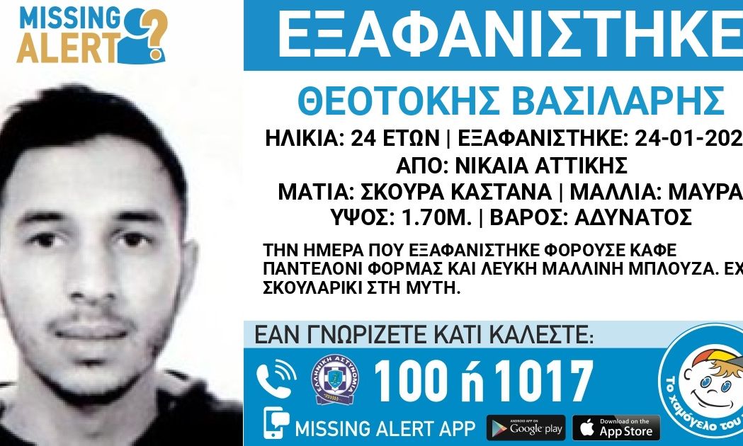 Συναγερμός επικρατεί στη Νίκαια Αττικής, καθώς από την Παρασκευή 24 Ιανουαρίου εξαφανίστηκε ο 24χρονος, Βασίλης Θεοτόκης.