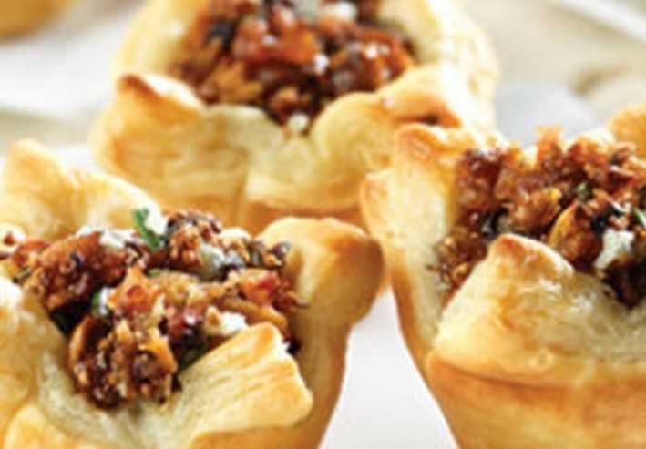 Ζεστάνετε το φούρνο στους 190° C. Σε ένα μεγάλο μπολ ανακατέψτε το μπέικον ψιλοκομμένο, τα αποξηραμένα, το μέλι, δεντρολίβανο και το μπλε τυρί.