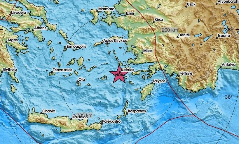 Το ακριβές επίκεντρο τη δόνησης εντοπίζεται στα 9 χλμ. νότια του Κέφαλου της Κω.