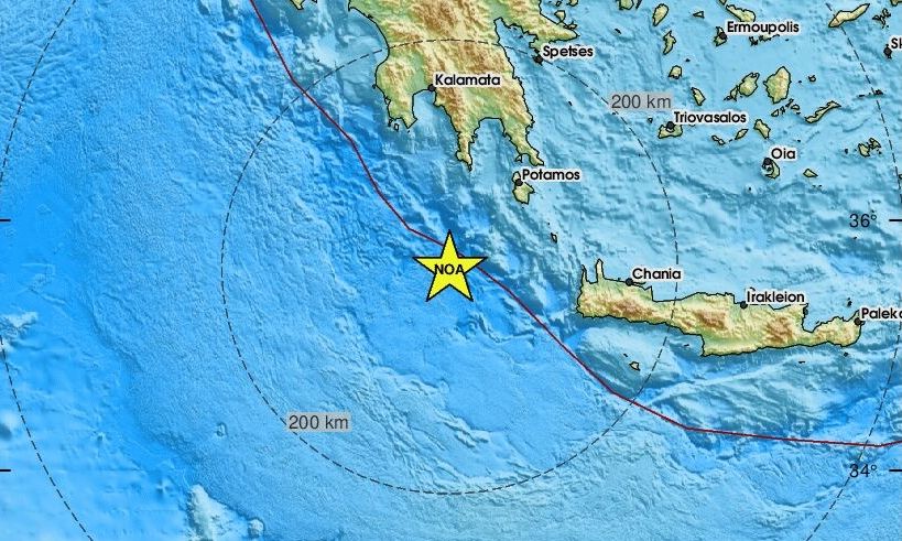 Το ακριβές επίκεντρο τη δόνησης εντοπίζεται στα 130 χλμ. νότια του Γυθείου.