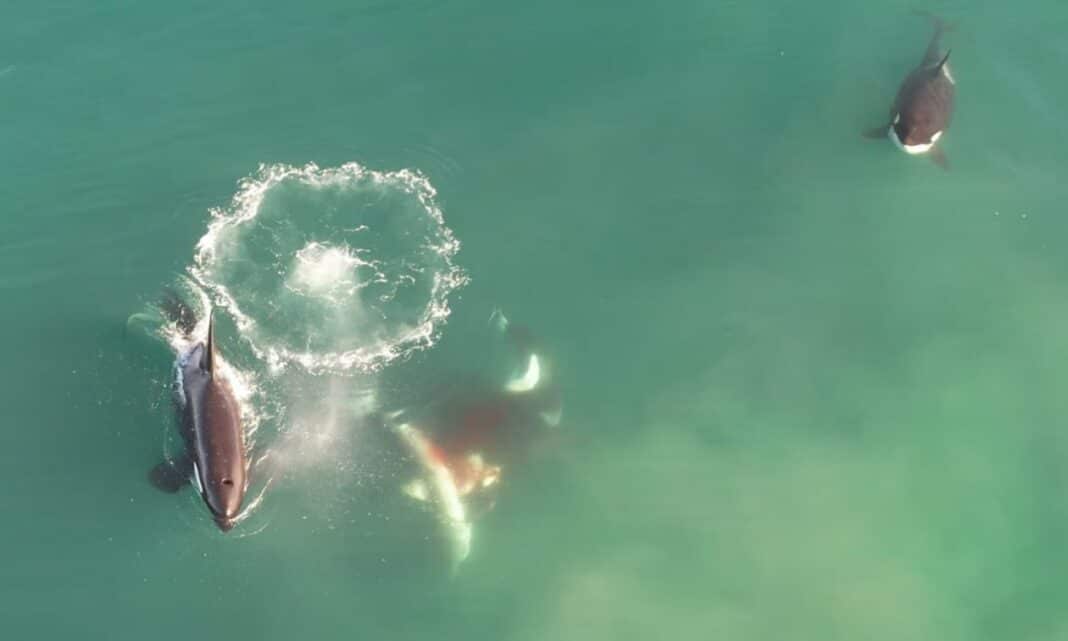 Στις 16 Μαΐου 2022, ο Christiaan Stopforth πετούσε με το drone του πάνω από τον κόλπο Mossel Bay, περίπου 190 μίλια ανατολικά του Gansbaai, όταν κατέγραψε κάτι εξαιρετικό: πέντε όρκες επιτέθηκαν σε έναν λευκό καρχαρία μήκους τριών μέτρων, δαγκώνοντας τον ανάμεσα στα θωρακικά πτερύγια και ξεριζώνοντας το συκώτι του.