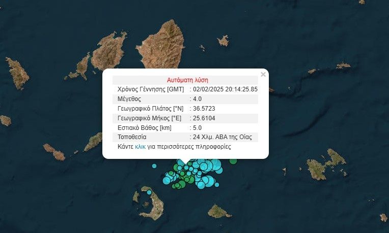 Συγκεκριμένα, το νησί «κουνήθηκε» στις 22:14 με το εστιακό βάθος να είναι 5 χλμ και η απόσταση από την Οία 24 χλμ.