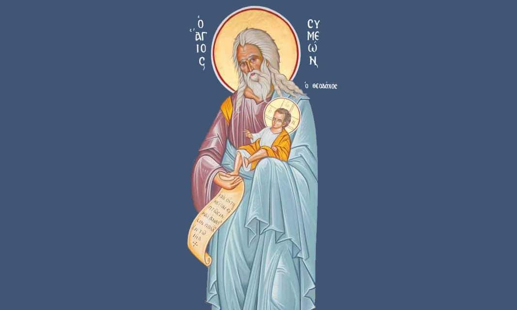 Σύμφωνα με τον συναξαριστή, ο Συμεών κατοικούσε στην Ιερουσαλήμ. Ήταν δίκαιος, ευλαβής και φωτισμένος από το Άγιο Πνεύμα, που του είχε φανερώσει ότι δε θα πέθαινε πριν δει το Χριστό. Η χαρμόσυνη αυτή πληροφορία τον εμψύχωνε ως τα βαθειά γεράματα του. Τέλος, ακριβώς σαράντα μέρες μετά τη γέννηση του Ιησού, το Πνεύμα τον πληροφόρησε ότι έπρεπε να πάει στο Ιερό. Ετοιμάστηκε, λοιπόν, με νεανική ζωηρότητα, πήγε εκεί και στάθηκε στην πόρτα, γεμάτος ευχαρίστηση και αγαλλίαση. Μέσα στην προσδοκία αυτή, φάνηκαν να έρχονται ο Ιωσήφ με την Παρθένο, που κρατούσε τον Ιησού. Ο Συμεών, πληροφορημένος από το Πνεύμα ότι το βρέφος αυτό είναι ο Χριστός, τρέχει και παίρνει τον Ιησού στην αγκαλιά του. Τον κρατάει ευλαβικά και, αφού καλά – καλά παρατήρησε το νήπιο και δέχθηκε όλη την ιλαρότητα της θείας μορφής του, ύψωσε το βλέμμα του επάνω και είπε ευχαριστώντας το Θεό: «Νυν απολύεις τον δούλον σου, Δέσποτα, κατά το ρήμα σου εν ειρήνη· ότι είδον οι οφθαλμοί μου το σωτήριόν σου, ο ητοίμασας κατά πρόσωπον πάντων των λαών, φως εις άποκάλυψιν εθνών και δόξαν λάου σου Ισραήλ». Τώρα, δηλαδή, πάρε την ψυχή μου Δέσποτα, σύμφωνα με το λόγο σου, ειρηνικά, διότι τα μάτια μου είδαν αυτόν που θα φέρει τη σωτηρία που ετοίμασες για όλους τους λαούς και θα είναι γι’ αυτούς φως, που θα αποκαλύψει τον αληθινό Θεό και θα δοξάσει το λαό σου Ισραήλ.