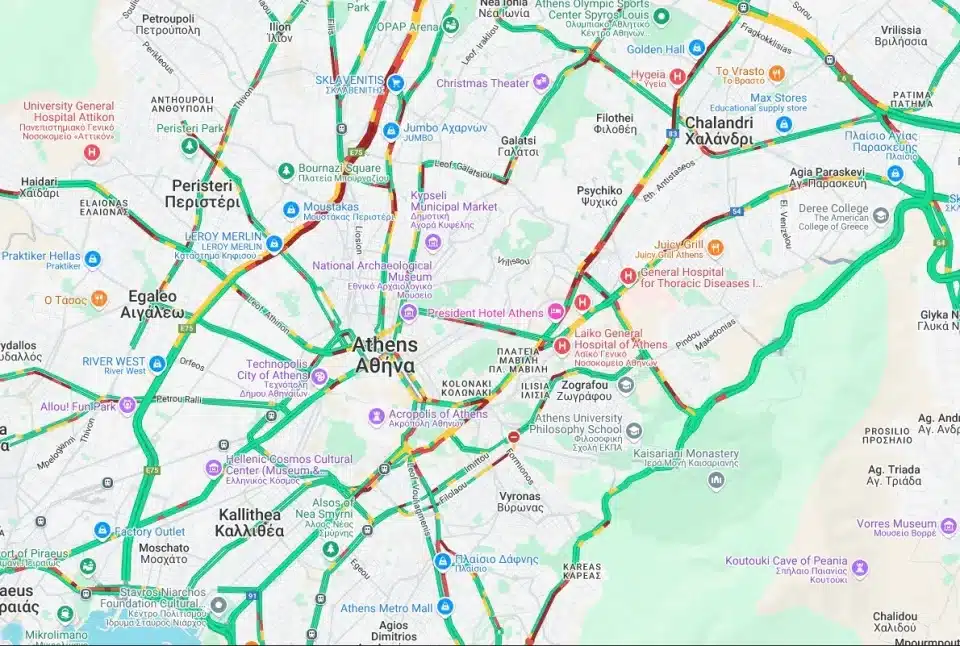 Επιπλέον, αυξημένη κυκλοφορία εντοπίζεται στη Λεωφόρο Αθηνών-Κορίνθου, τόσο στην είσοδο όσο και στην έξοδο, με τα μεγαλύτερα προβλήματα να παρατηρούνται από το Δαφνί έως τα Διυλιστήρια.