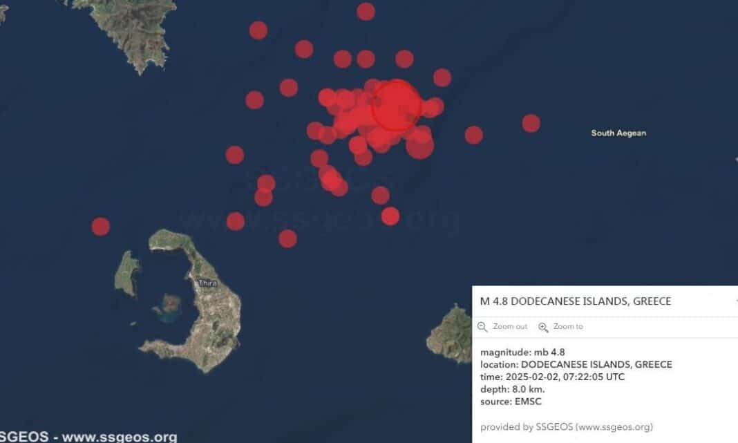 Ένα σμήνος σεισμών βρίσκεται σε εξέλιξη στα Δωδεκάνησα, στην Ελλάδα. Περισσότερες από 70 δονήσεις μεγέθους 3 και άνω σημειώθηκαν τις τελευταίες ημέρες. Η ισχυρότερη δόνηση μέχρι στιγμής μετρήθηκε στα 4,8 Ρίχτερ σήμερα το πρωί. Το 1956 στο νησί Θήρα (Σαντορίνη) σημειώθηκε σεισμός Μ7,5 Ρίχτερ.