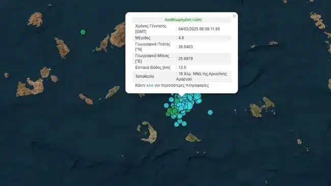 Σεισμός σημειώθηκε στις 8:09 της Τρίτης (04/02) ανοικτά της Αμοργού, μεγέθους 4,8 Ρίχτερ. Σύμφωνα με την αναθεωρημένη λύση του Γεωδυναμικού Ινστιτούτου, το εστιακό βάθος του σεισμού είναι στα 13,5 χιλιόμετρα και το επίκεντρο στα 19 χλμ. νότια – νοτιοδυτικά της Αρκεσίνης Αμοργού.