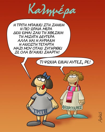 Ο γνωστός σκιτσογράφος Αρκάς, με το χαρακτηριστικό του χιούμορ, μας χαρίζει ακόμα ένα σκίτσο που αποτυπώνει την αλληλεπίδραση των ημερών της εβδομάδας με μοναδικό τρόπο.