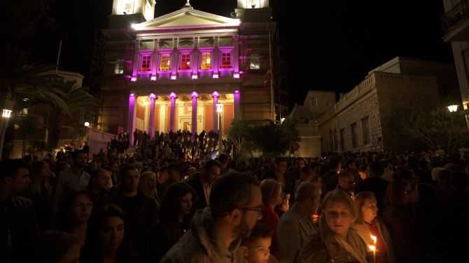 Από τους ορθόδοξους ναούς του Αγίου Νικολάου, της Κοίμησης της Θεοτόκου και της Μεταμόρφωσης του Σωτήρος πορεύονται αυτοί των ορθοδόξων για να συναντηθούν όλοι μαζί στην πλατεία Μιαούλη, μπροστά στο Δημαρχείο όπου ψάλλονται τροπάρια της Μεγάλης Παρασκευής από τη χορωδία της ορθόδοξης ενορίας του Αγίου Νικολάου, δημιουργώντας μια συγκινητική ατμόσφαιρα.