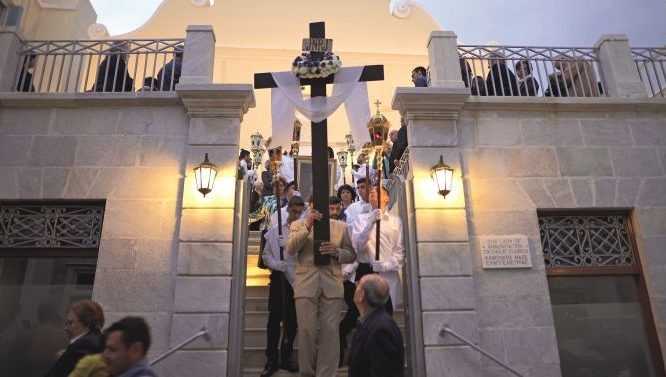 Από τους ορθόδοξους ναούς του Αγίου Νικολάου, της Κοίμησης της Θεοτόκου και της Μεταμόρφωσης του Σωτήρος πορεύονται αυτοί των ορθοδόξων για να συναντηθούν όλοι μαζί στην πλατεία Μιαούλη, μπροστά στο Δημαρχείο όπου ψάλλονται τροπάρια της Μεγάλης Παρασκευής από τη χορωδία της ορθόδοξης ενορίας του Αγίου Νικολάου, δημιουργώντας μια συγκινητική ατμόσφαιρα.
