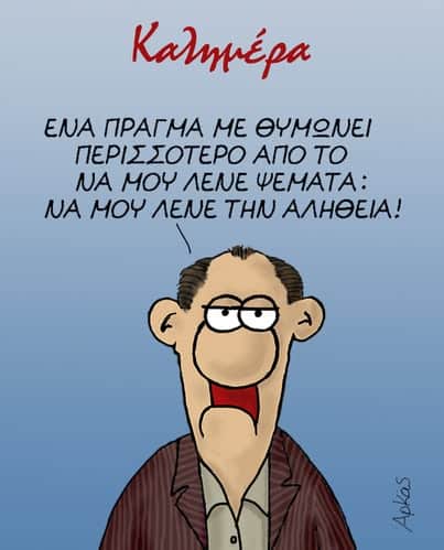 Ο γνωστός σκιτσογράφος Αρκάς, επιστρέφει με μία ακόμα καυστική ατάκα, γεμάτη ειρωνεία και ανατροπή. Στη σημερινή γελοιογραφία του, ένας άνδρας με σοβαρή έκφραση δηλώνει: «Ένα πράγμα με εξοργίζει περισσότερο από το να μου λένε ψέματα: να μου λένε την αλήθεια!».