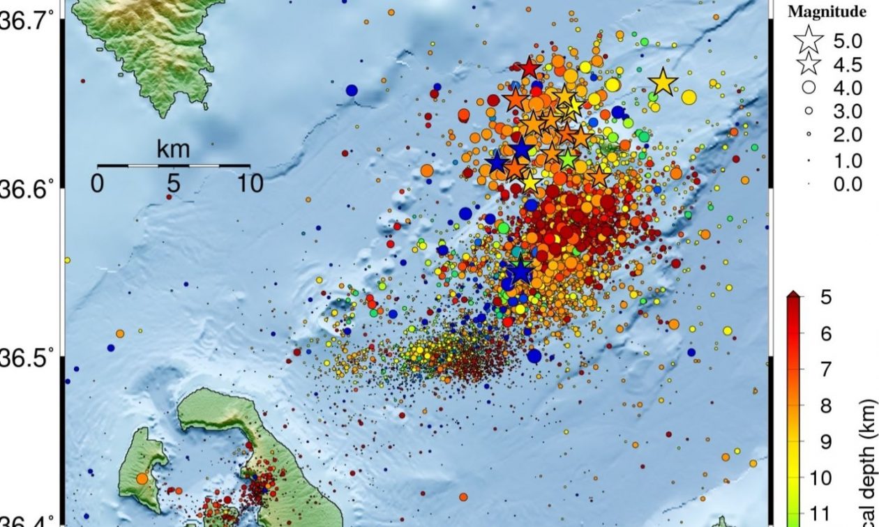Χάρτης κατανομής σεισμών στην περιοχή των Κυκλάδων (Σαντορίνη-Αμοργός-Ίος). Η ακτίνα των κύκλων είναι ανάλογη του μεγέθους του σεισμού (επεξήγηση επάνω δεξιά), ενώ τα μεγέθη σεισμών μεγαλύτερα ή ίσα του 4.5 σημειώνονται με αστέρι. Ο χρωματισμός ανταποκρίνεται στο εστιακό βάθος, σύμφωνα με τη χρωματική κλίμακα (δεξιά).