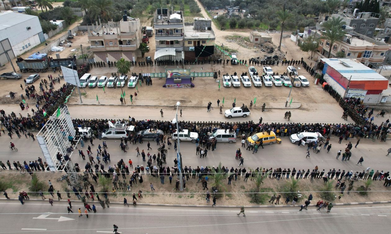 Τους Ohad Ben-Ami, Eli Sharabi και Or Levy αναμένεται να παραλάβουν οχήματα του Ερυθρού Σταυρού που έφτασαν στο σημείο συλλογής των τριών απαχθέντων στο Deir al-Balah στην κεντρική Λωρίδα της Γάζας, όπου οι μαχητές της Χαμάς συγκεντρώθηκαν δίπλα σε μια πλατφόρμα που είχαν στήσει με προπαγανδιστικά πλακάτ πάνω της. Στη σκηνή, η οποία προετοιμάστηκε επίσης για μια «τελετή» απελευθέρωσης των ομήρων, γράφτηκε ένα μήνυμα στον πρόεδρο των ΗΠΑ Ντόναλντ Τραμπ, με φόντο το σχέδιό του να καταλάβει τη Λωρίδα της Γάζας: «Είμαστε η επόμενη μέρα». Επιπλέον, κρέμασαν μια πινακίδα με την επιγραφή “Total Victory”, με μια φωτογραφία του πρωθυπουργού Benjamin Netanyahu.