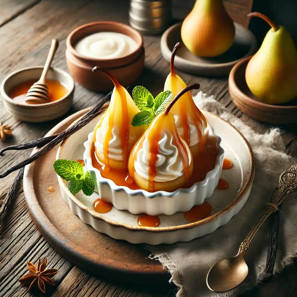 Τα αχλάδια με κρέμα ζαχαροπλαστικής είναι ένα εντυπωσιακό και διαφορετικό επιδόρπιο που συνδυάζει τη φρεσκάδα του φρούτου με τη βελούδινη υφή της κρέμας. Ιδανικό για γιορτινά τραπέζια ή ιδιαίτερες περιστάσεις, αυτή η συνταγή υπόσχεται να καταπλήξει τους καλεσμένους σας.