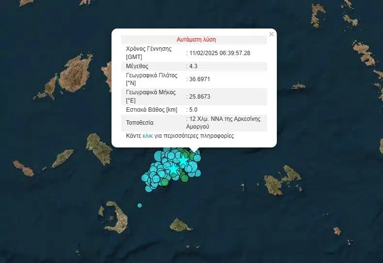 Νέα σεισμική δόνηση 4,3 Ρίχτερ σημειώθηκε ανοιχτά της Αμοργού, πριν λίγα λεπτά. Σύμφωνα με τη νεότερη εκτίμηση του Γεωδυναμικού Ινστιτούτου Αθηνών, ο σεισμός υπολογίζεται στα 4,3 Ρίχτερ, ενώ το εστιακό βάθος υπολογίζεται στα 5 χιλιόμετρα.