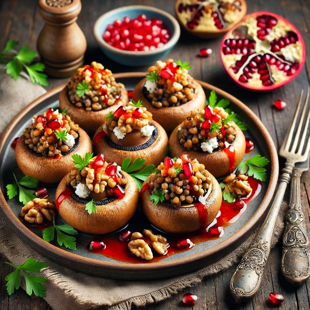 Αν ψάχνετε για μια διαφορετική και δημιουργική πρόταση για γεμιστά μανιτάρια, αυτή η συνταγή θα σας ενθουσιάσει! Ο συνδυασμός της γήινης γεύσης των μανιταριών με την πρωτεΐνη από τις φακές, την αλμυρή φέτα και την γλυκόξινη πικάντικη σάλτσα ροδιού θα δώσει έναν γκουρμέ χαρακτήρα στο τραπέζι σας. Αυτή η συνταγή είναι ιδανική τόσο για χορτοφάγους όσο και για όσους αναζητούν νέες γεύσεις.