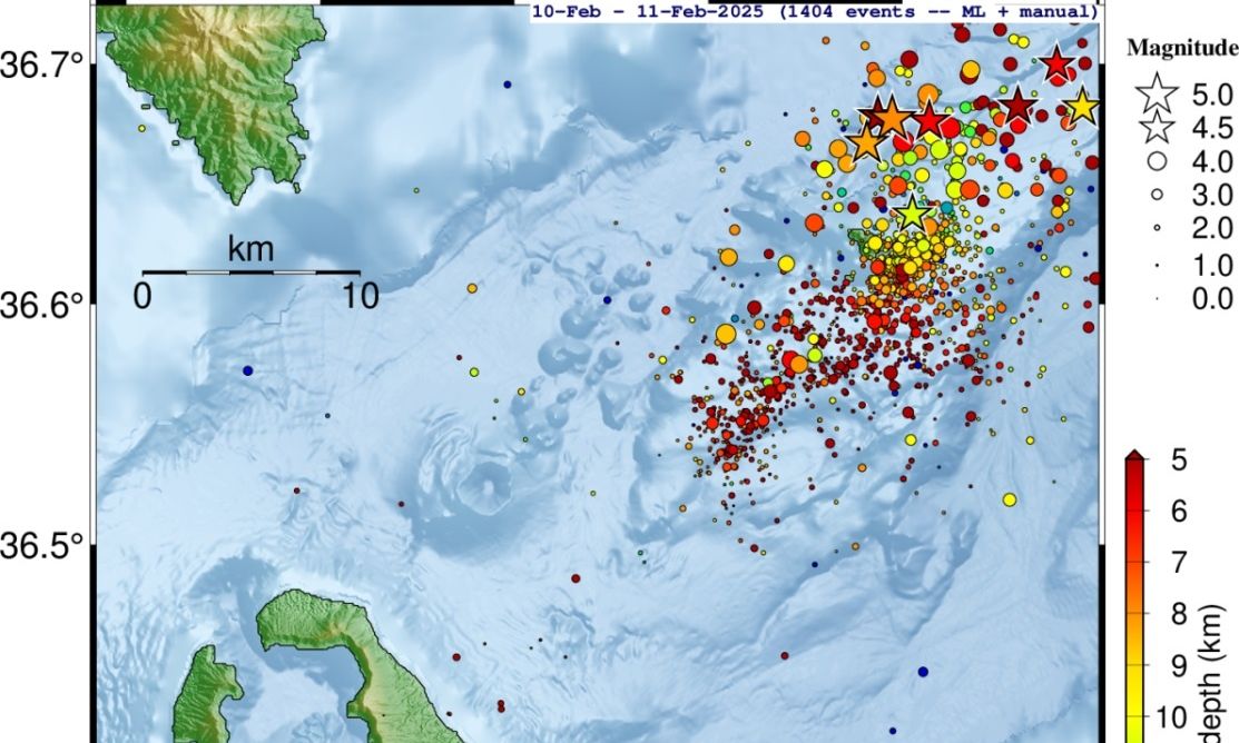 Από την έναρξη της σεισμικής δραστηριότητας στη ζώνη Σαντορίνης-Αμοργού στις 26 Ιανουαρίου έως και τις 10 Φεβρουαρίου 2025, το Εργαστήριο Σεισμολογίας (ΕΣ) του ΕΚΠΑ (http://dggsl.geol.uoa.gr/) έχει ανιχνεύσει και εντοπίσει συνολικά, με αυστηρά κριτήρια για τη διασφάλιση της ποιότητας των αποτελεσμάτων, πάνω από 15,300 σεισμούς με μεθόδους μηχανικής μάθησης, εκ των οποίων άνω των 13,200 με μεγέθη Μ³1.0. Στις 10 Φεβρουαρίου καταγράφηκαν πάνω από 1,200 σεισμοί, με ~240 να έχουν μέγεθος Μ³2.5, 13 σεισμούς με Μ³4.0, και 4 σεισμούς με Μ³4.5, με τον μεγαλύτερο σεισμό να έχει μέγεθος 5.2. Σύμφωνα με τα στοιχεία καθημερινής ανάλυσης σεισμικών δεδομένων του Εργαστηρίου Σεισμολογίας του ΕΚΠΑ (χωρίς χρήση μεθόδων μηχανικής μάθησης), κατά την 11η Φεβρουαρίου έχουν καταγραφεί πάνω από 100 σεισμοί, εκ των οποίων 16 με μεγέθη M≥4.0 και 4 με Μ≥4.5, ενώ ο μεγαλύτερος σεισμός σημειώθηκε στις 09:17:20 τοπική ώρα και είχε μέγεθος 4.8.