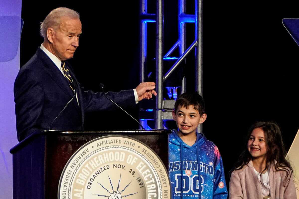 Μόλις είχε ξεκινήσει να εκφωνεί μια ομιλία στον Διεθνή Σύλλογο Ηλεκτρολόγων στην Ουάσιγκτον, ο Μπάιντεν αστειεύτηκε ότι «είχε πάρει άδεια» ώστε να αγκαλιάσει τον πρόεδρο του συνδικάτου Λόνι Στίβενσον.