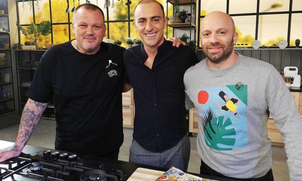 Ο Κώστας με τους δύο παρουσιαστές μαγειρεύουν ένα διαφορετικό τραχανότο με ανθότυρο και σπαράγγια και ετοιμάζουν σάντουιτς με λουκάνικο, τυρί κασκαβάλ και λαχανικά σοτέ.