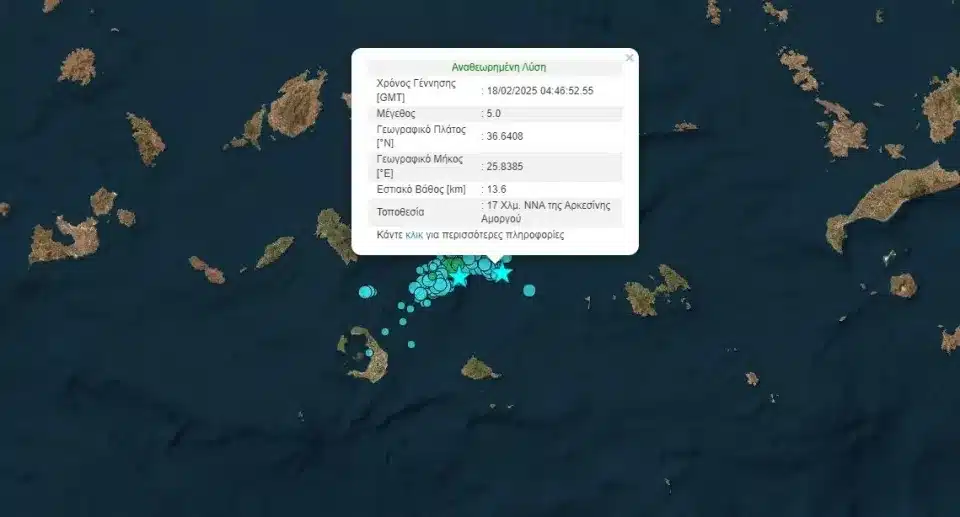 Νέα σεισμική δόνηση καταγράφηκε στη θαλάσσια περιοχή κοντά στην Αμοργό, με το εστιακό βάθος να εκτιμάται στα 13,6 χιλιόμετρα. Το επίκεντρο του σεισμού εντοπίζεται περίπου 17 χιλιόμετρα νότια-νοτιοανατολικά της Αρκεσίνης Αμοργού.