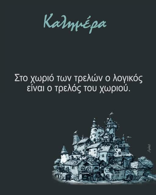 Η εικόνα που βλέπουμε είναι χαρακτηριστική του ύφους του: μια απλή φράση, που φαινομενικά μοιάζει χιουμοριστική, αλλά κρύβει βαθύτερα νοήματα. «το χωριό των τρελών, ο λογικός είναι ο τρελός του χωριού» – μια φράση που αντικατοπτρίζει την αντιστροφή της λογικής σε έναν κόσμο όπου ο παραλογισμός έχει γίνει κανόνας.