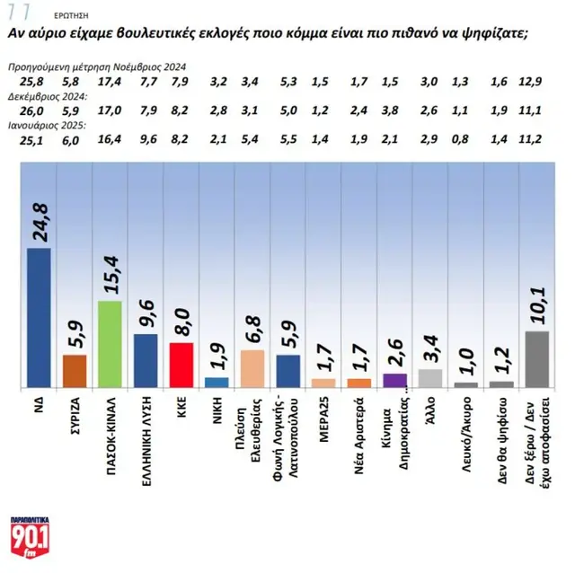 Στην πρόθεση ψήφου, η Νέα Δημοκρατία συγκεντρώνει 24,8%, διατηρώντας σημαντική διαφορά 9,4 ποσοστιαίων μονάδων από το ΠΑΣΟΚ, το οποίο καταγράφει 15,4%. Παράλληλα, η Ελληνική Λύση ενισχύεται με ποσοστό 9,6%, ενώ η Πλεύση Ελευθερίας καταγράφει 6,8%. Ιδιαίτερο ενδιαφέρον παρουσιάζει η Φωνή Λογικής, που αγγίζει το 5,9%, το ίδιο ποσοστό που συγκεντρώνει και ο ΣΥΡΙΖΑ, δείχνοντας υποχώρηση σε σύγκριση με το παρελθόν. Αντίθετα, το ΚΚΕ εμφανίζεται ενισχυμένο με ποσοστό 8%, προσπερνώντας τον ΣΥΡΙΖΑ.