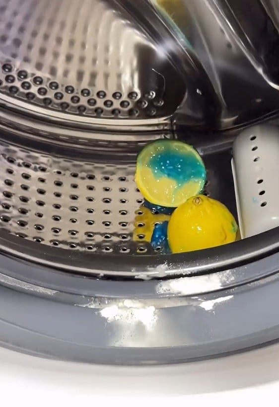 Τοποθετήστε τα επικαλυμμένα με οδοντόκρεμα μισά λεμόνι στον κάδο του πλυντηρίου. Τόσο απλά. Απλά “πετάξτε” το μέσα…
