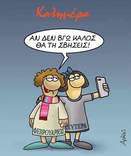 Στο σημερινό σκίτσο, δύο γνώριμες φιγούρες πρωταγωνιστούν: ο Φεβρουάριος και η Δευτέρα. Η Δευτέρα, ντυμένη στα γκρι, με μπλε φιόγκο στα μαλλιά, κρατά το κινητό της έτοιμη να τραβήξει μια selfie με τον φίλο της, τον Φεβρουάριο. Εκείνος, τυλιγμένος με ένα πολύχρωμο κασκόλ, δεν δείχνει τόσο σίγουρος για το αποτέλεσμα της φωτογραφίας.