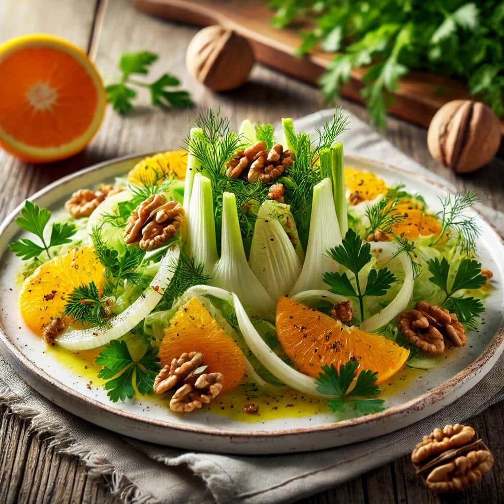 Το φινόκιο, γνωστό και ως μαραθόριζα, έχει μια δροσιστική γεύση με νότες γλυκάνισου που συνδυάζεται υπέροχα με τα εσπεριδοειδή. Αυτή η σαλάτα είναι ιδανική για συνοδευτικό ή ελαφρύ γεύμα, προσφέροντας μοναδικούς συνδυασμούς γεύσεων και υφών.