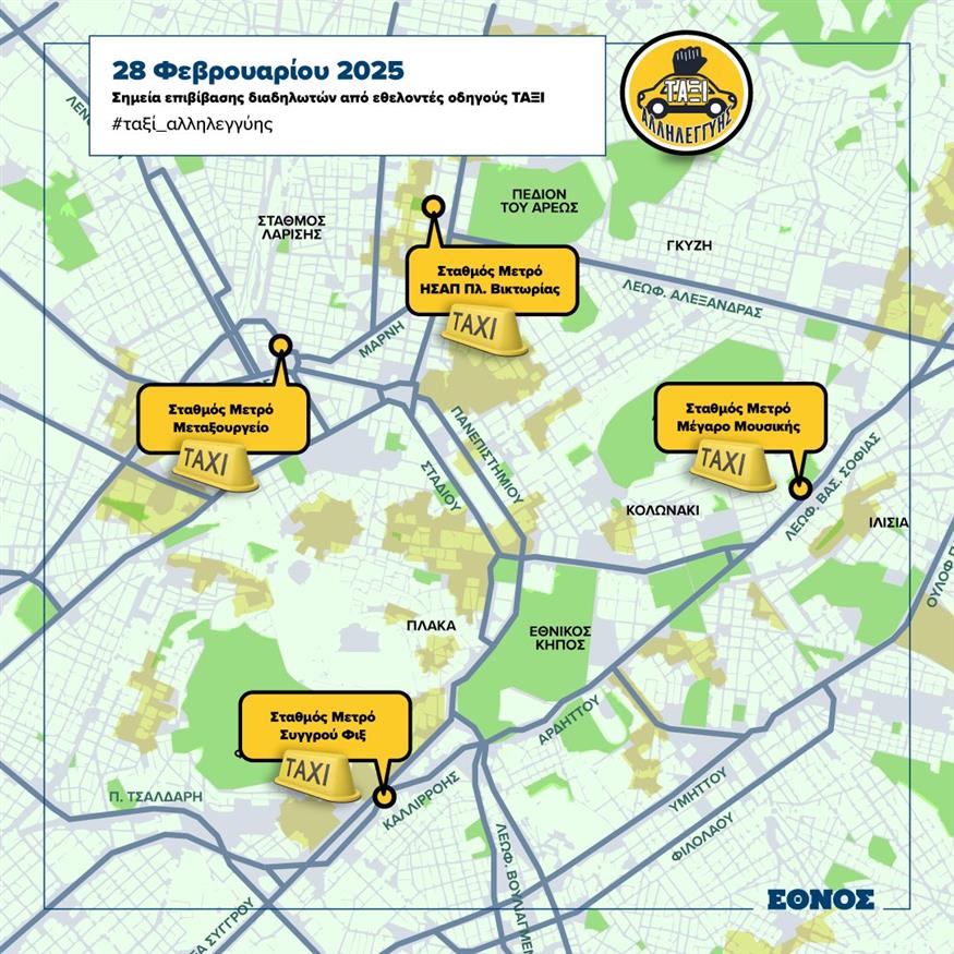 Οι διαδηλωτές μπορούν να επιβιβαστούν στα «Ταξί Αλληλεγγύης» από τα εξής σημεία στην Αθήνα: