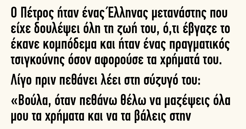 O Πέτρος ήταν ένας Έλληνας μετανάστης που είχε δουλέψει όλη τη ζωή του, ό,τι έβγαζε το έκανε κομπόδεμα και ήταν ένας πραγματικός τσιγκούνης όσον αφορούσε τα χρήματά του